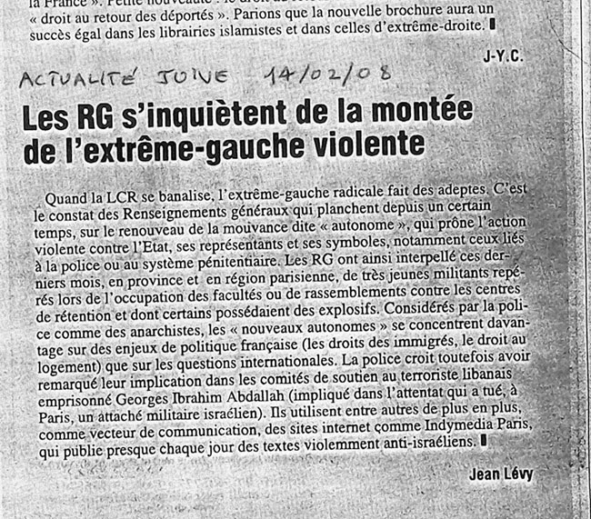 Nota bene : On relèvera dans l'article ci-dessous, la référence faite au site Indymedia, présenté comme subversif, alors qu'il ne s'agit que d'une officine tenue par les sionistes de gauche, communistes, autres membres de la DST. Les sites de la série Indymedia servent à encadrer les excités immatures, et surtout, à les écarter de toute prise de conscience en ce qui concerne Israël et le sionisme, comme à ne pas faire le lien entre capitalisme et sionisme, et à interdire l'emploi du terme "génocide" en ce qui concerne les Palestiniens, et "génocideurs", en ce qui concerne les sionistes. Les sites Indymedias sont principalement en France sous la houlette des fameux "juifs pour la paix", l'UJFP ; Union des juifs français pour la paix, des communo-sionistes, basés au 21 ter rue Voltaire à Paris 11ème, l'un des deux centres sionistes de contrôle social - l'autre étant domicilié à la libraire "Résistance" de la CAPJO-Europalestine d'Olivia Zémor (Paris 17ème), Zémor étant un autre membre de la DST. Le 21 ter rue Voltaire est d'ailleurs l'endroit même ou sévissent les grands copains d'Actualité juive, ceux du Scalp réflex. Comme le monde est petit, enfin surtout ce monde là, et comme il devient limpide, si on veut bien y voir clair). Le Scalp réflex est très très bien vu par la Fédération des anarchistes (FA) d'état (grassement subventionnés), de la rue Amelot (librairie du Monde Libertaire siège à Paris 11ème -Radio dite "libre" "Radio Libertaire" 89,4 Mgh sur l'Île de France, et la CNT-Confédération nationale du Travail (supposée anarchiste) du 33 rue des Vignoles - Paris 20ème. Ces deux officines de la DST sont appelées à remplacer la LCR comme police de proximité et manipulatoire avec Butagaz, des excités.